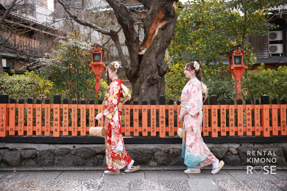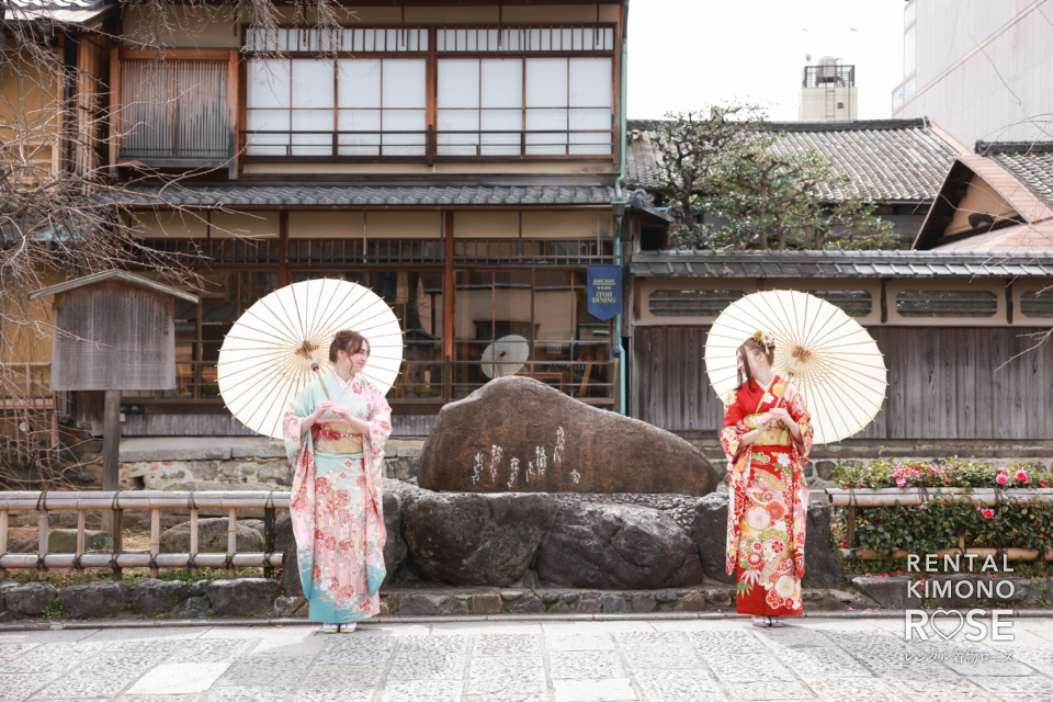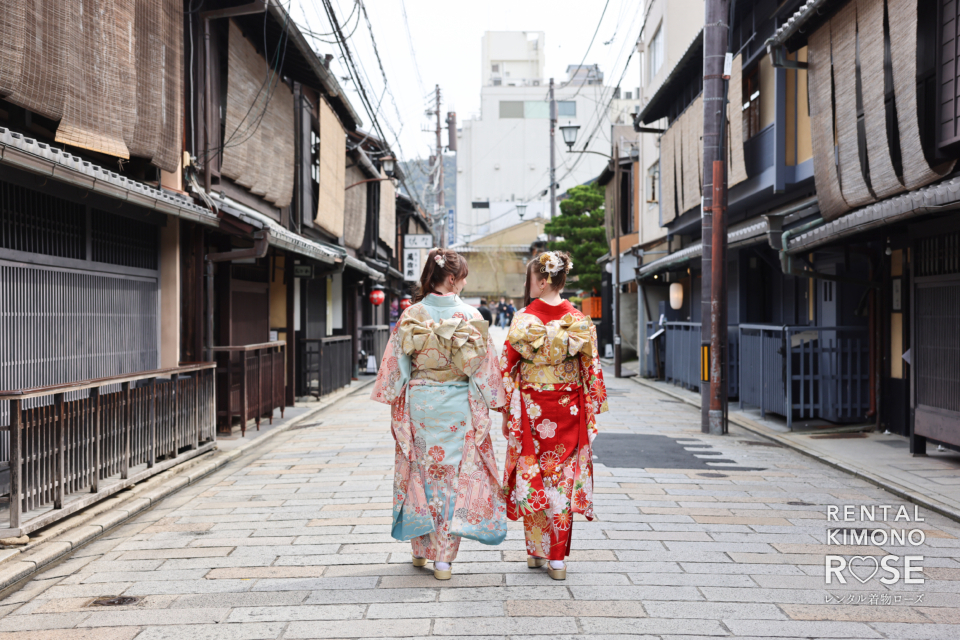 華やかな振袖に身を包み、石畳の続く祇園の街並みを歩くおふたり。
